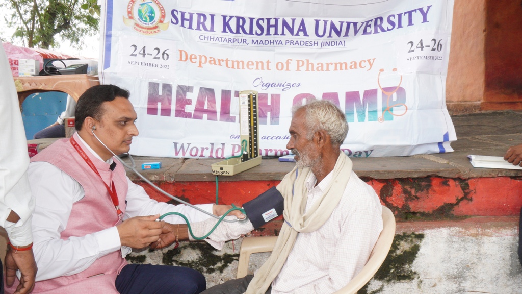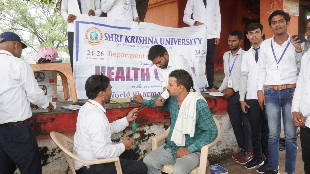श्री कृष्णा विश्वविद्यालय, छतरपुर के फार्मेसी विभाग द्वारा विश्व फार्मेसिस्ट दिवस के अवसर पर प्रथम चरण में एक दिवसीय निःशुल्क चिकित्सा शिविर का आयोजन