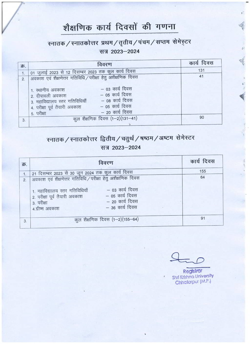 - In case the academic work is less than the prescribed standard days due to unavoidable reasons, the duration of academic periods at the university level should be increased as per the requirement to fulfill the academic days so that the compliance of the academic calendar can be ensured on time.